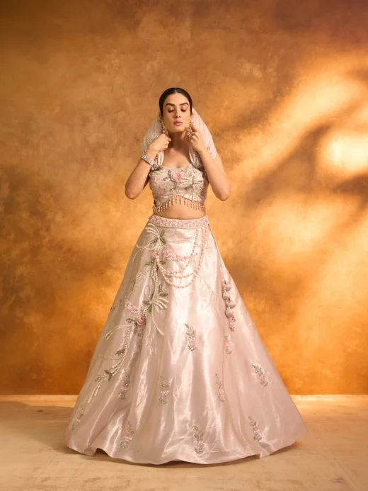 Accompanying the lehenga is a chic crop top that perfectly complements the traditional skirt. The crop top is designed with matching embroidery and embellishments, ensuring a cohesive and polished look. Its modern cut and fit offer a contemporary twist, making the outfit suitable for fashion-forward individuals. The combination of the crop top with the traditional lehenga strikes a perfect balance, offering a stylish and trendy appearance.