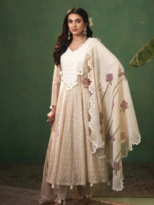 Pure Chanderi & Art Raw Silk Pearl Hand Embroidery Kalidaar Set