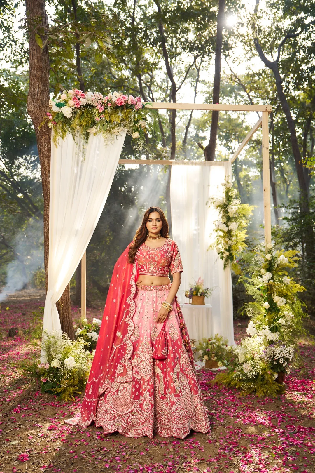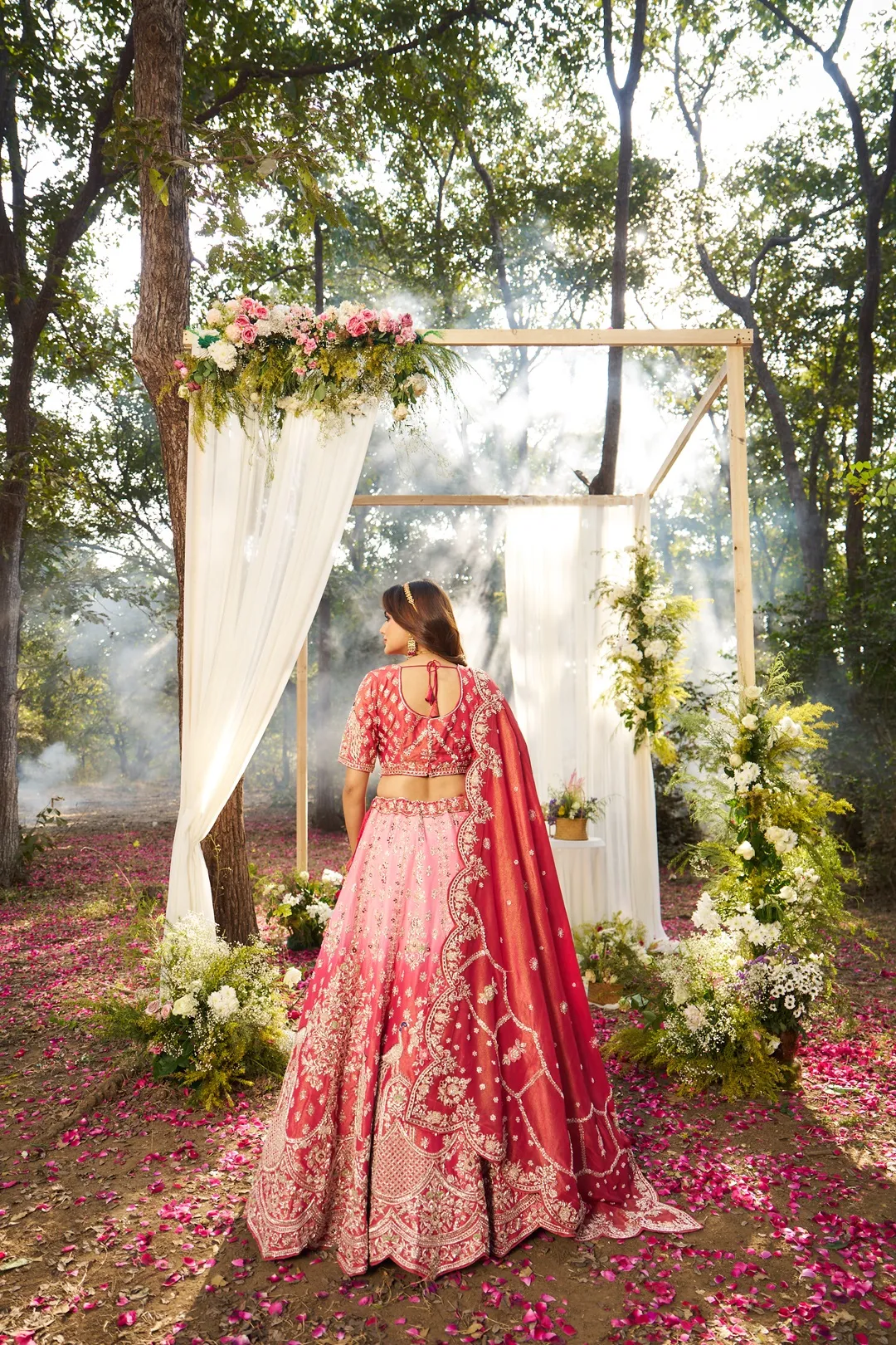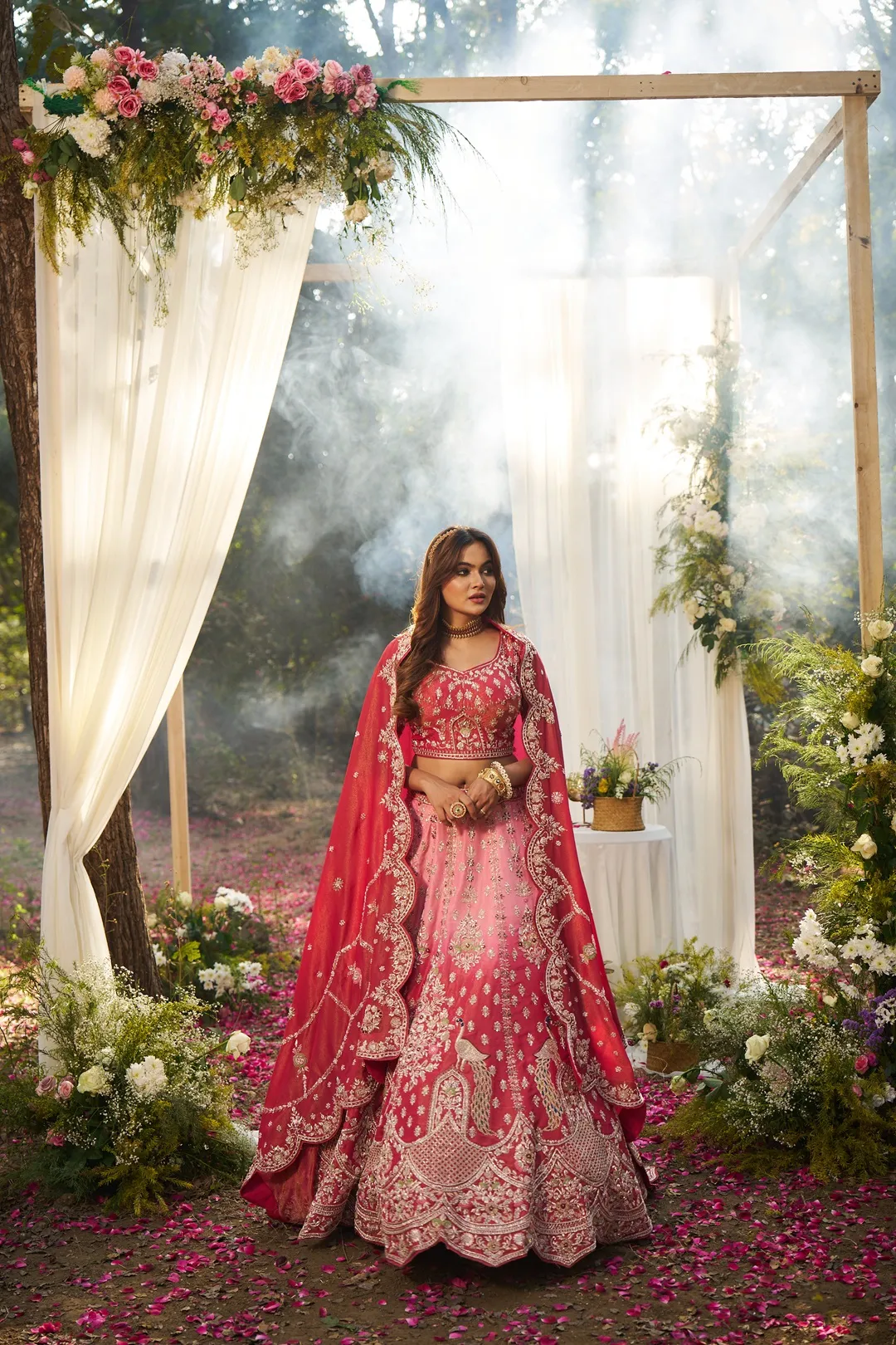 A refined shaded bridal lehenga crafted in luminous tissue fabric, featuring a soft tonal transition from blush pink at the waist to deeper coral hues towards the hem. The blouse is adorned with intricate floral zardosi and resham embroidery, complemented by short sleeves and delicate border detailing for a structured, elegant finish. The lehenga skirt is detailed with subtle embroidered motifs across the upper panels, transitioning into a richly embellished lower half showcasing peacock-inspired zardosi embroidery. The scalloped hemline is finished with dense hand embroidery, enhancing the fluid movement and ceremonial grandeur of the silhouette. Paired with a matching shaded tissue dupatta featuring embroidered buttis and a scalloped zari border, this ensemble balances lightness, depth, and traditional bridal artistry.