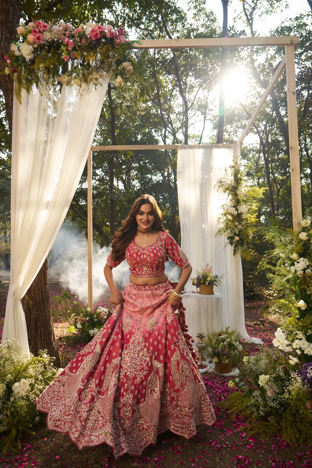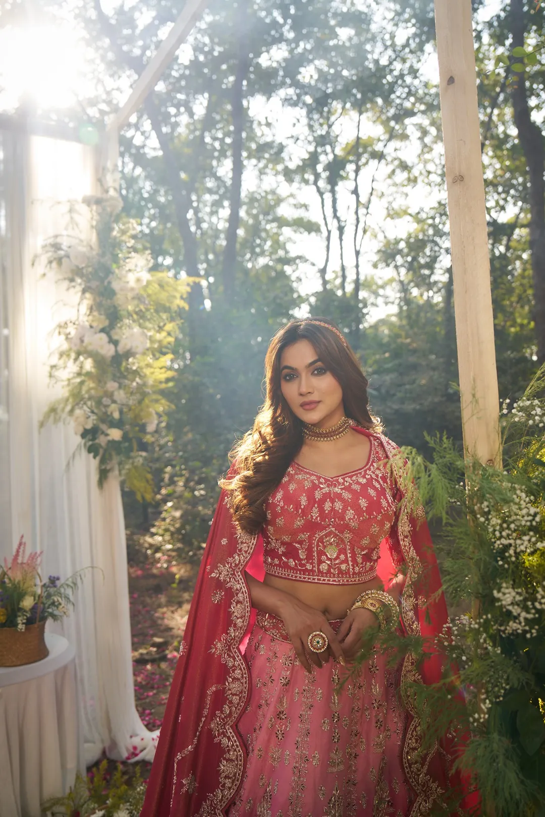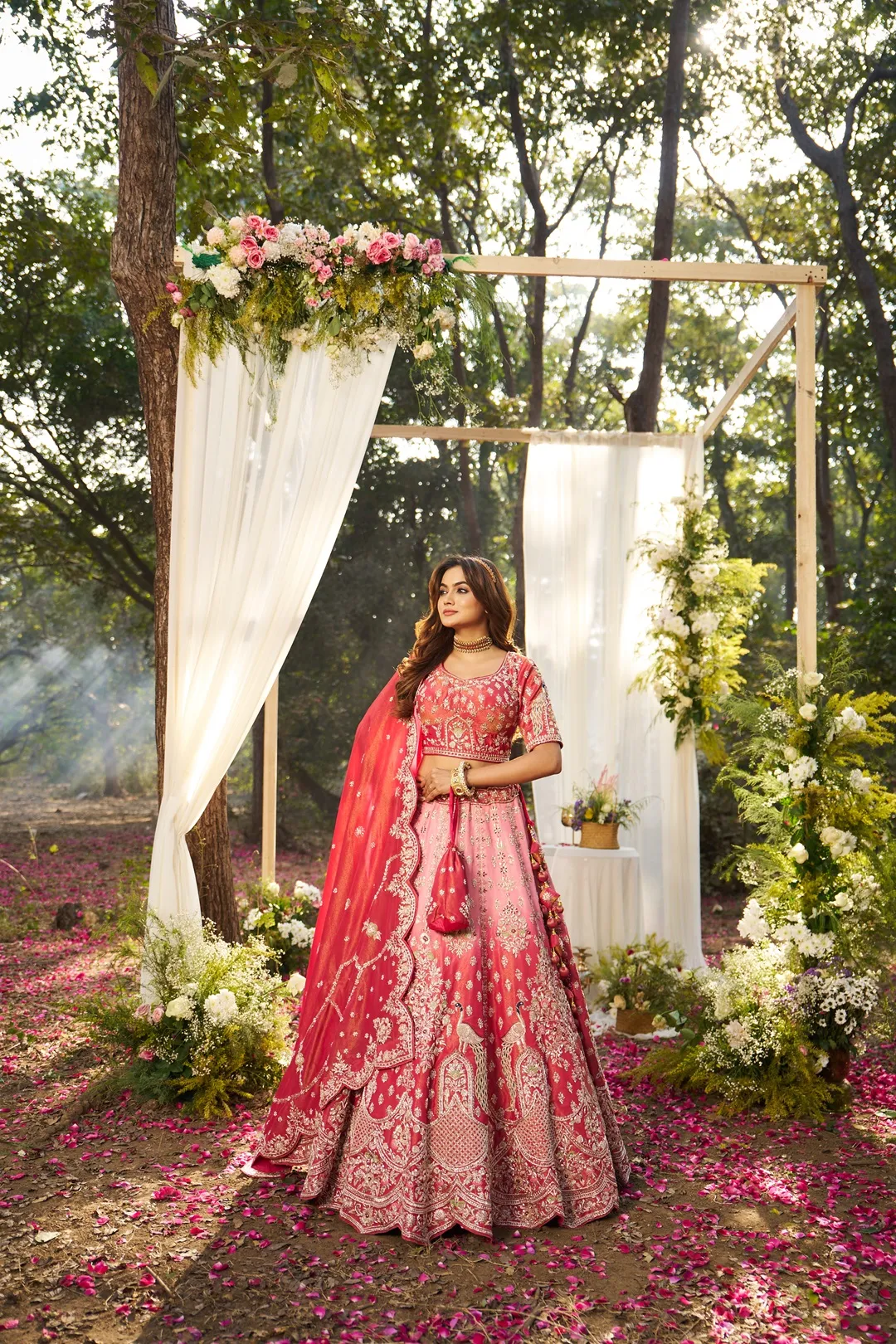 A refined shaded bridal lehenga crafted in luminous tissue fabric, featuring a soft tonal transition from blush pink at the waist to deeper coral hues towards the hem. The blouse is adorned with intricate floral zardosi and resham embroidery, complemented by short sleeves and delicate border detailing for a structured, elegant finish. The lehenga skirt is detailed with subtle embroidered motifs across the upper panels, transitioning into a richly embellished lower half showcasing peacock-inspired zardosi embroidery. The scalloped hemline is finished with dense hand embroidery, enhancing the fluid movement and ceremonial grandeur of the silhouette. Paired with a matching shaded tissue dupatta featuring embroidered buttis and a scalloped zari border, this ensemble balances lightness, depth, and traditional bridal artistry.