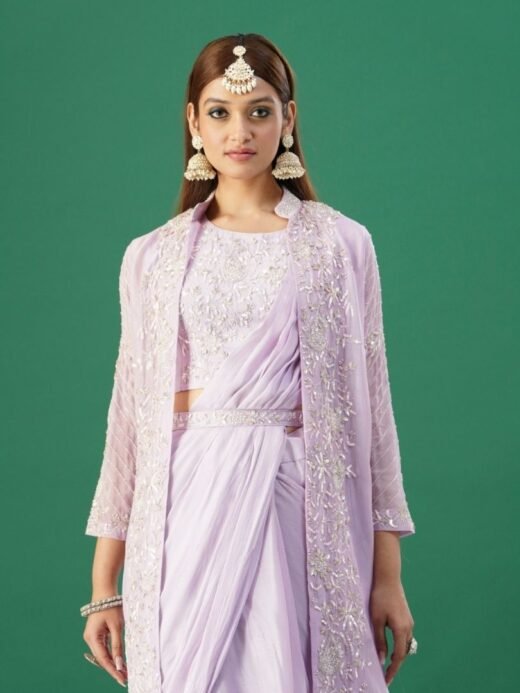 Elevate your ethnic style with our breathtaking Lavender Lucknowi Embroidered Georgette Anarkali Dress. This stunning set features a sleeveless kurta with a sweetheart neckline, paired with matching pants and a dupatta.