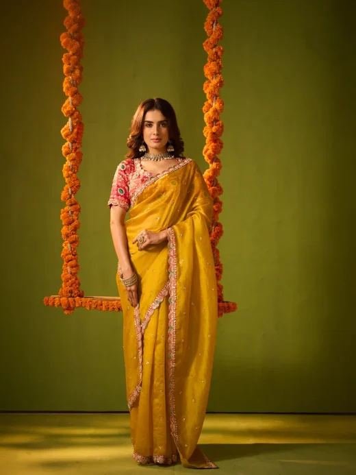 Lavender pre drapped saree with butterfly shaped heavily embroidered pastel cutdana blouse with tie knots at backs