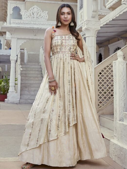 Red silk gown with sequins all over paired with contrasting green printed dupatta