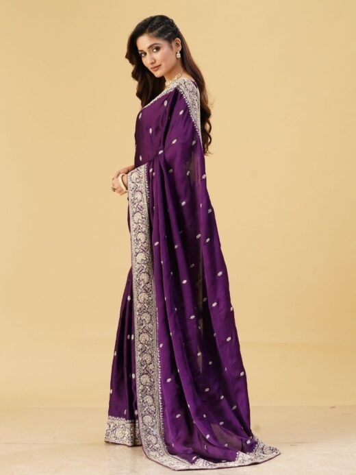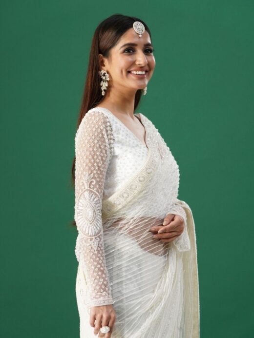 Make a stunning style statement with this silver lycra saree paired with a beautifully embroidered corset blouse. The fluid drape of the lycra saree creates a sculpted, modern silhouette, while the structured vibrant corset adds a burst of colour and opulence. This ensemble is ideal for cocktail parties, receptions, and festive celebrations.