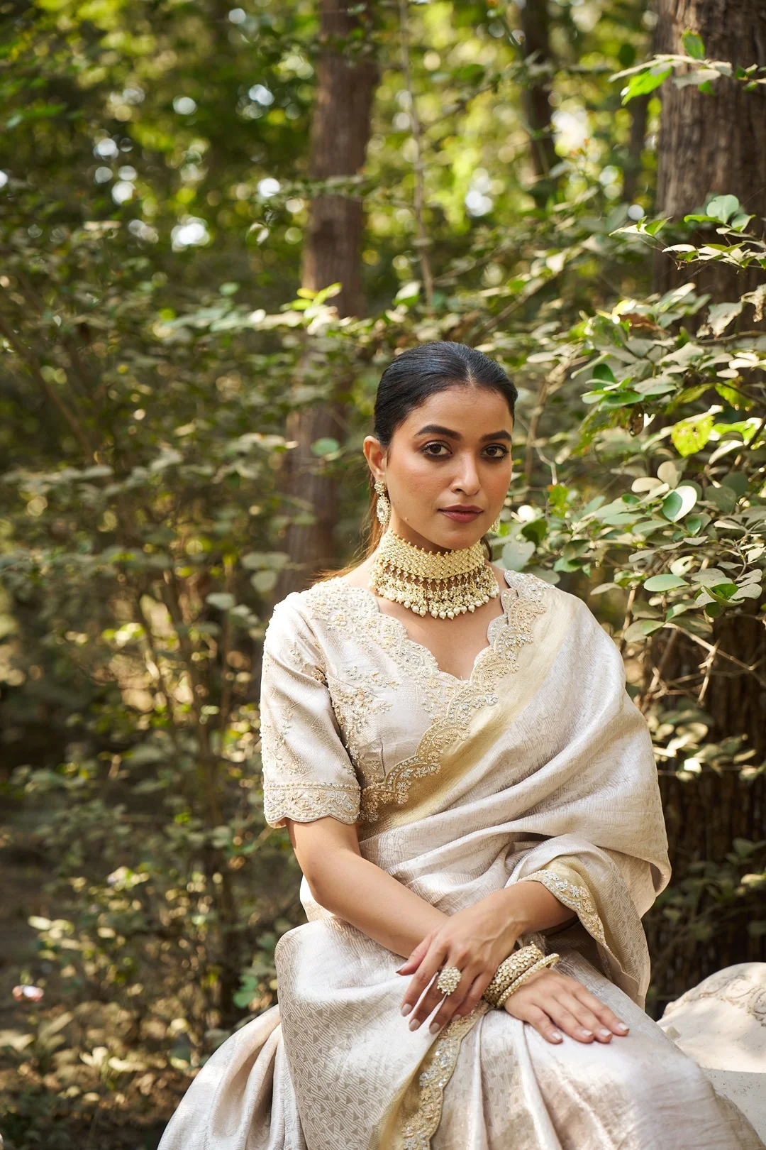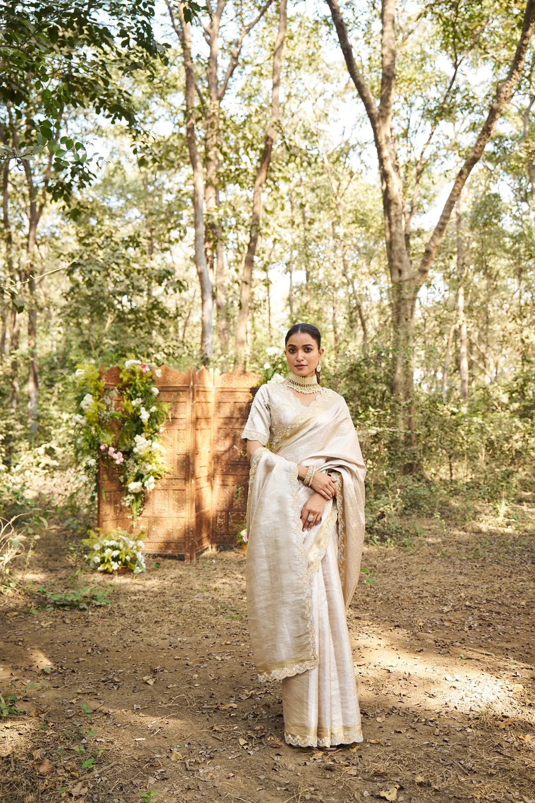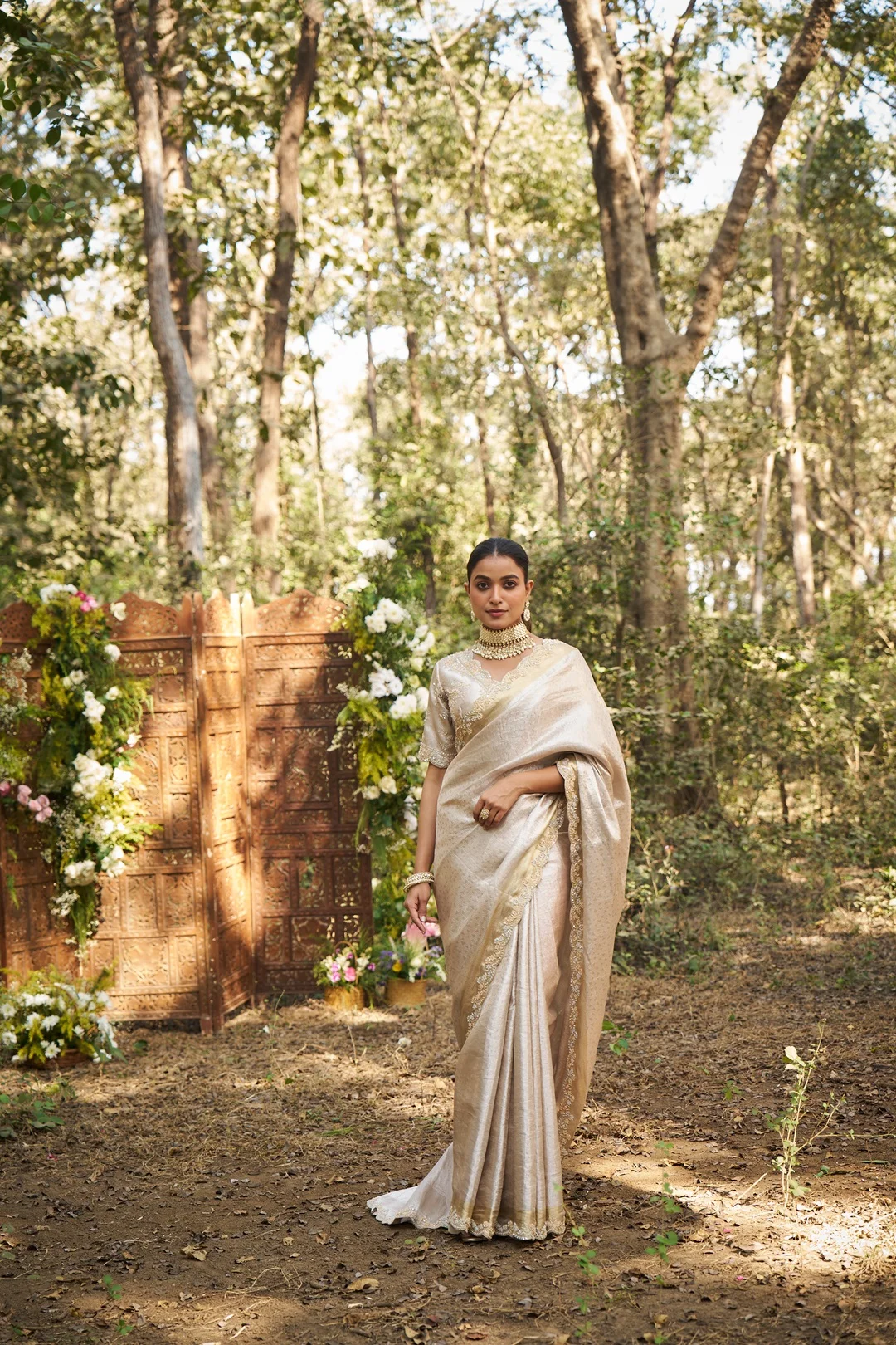 An elegant silver tissue saree crafted for understated bridal and wedding wear, featuring a soft metallic sheen and fluid drape. The saree is detailed with a fine all-over woven texture and finished with a delicately embroidered zari border accented with subtle floral hand embroidery. The pallu remains refined and minimal, allowing the fabric’s natural luminosity and border craftsmanship to take focus. Paired with a matching silver blouse featuring coordinated zari and floral embroidery, this saree is ideal for brides and wedding guests who prefer refined elegance over heavy ornamentation.
