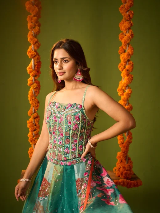 White organza lehenga with colourful floral embroidery paired with embroidered blouse and net dupatta