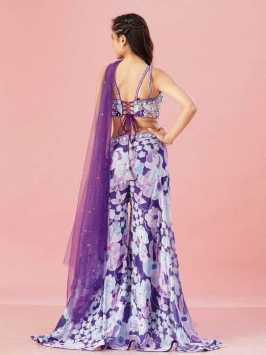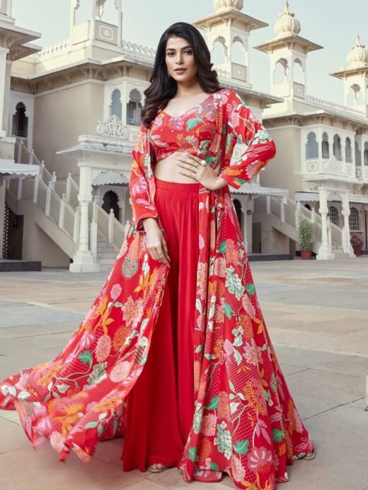 Make a statement at festivals, parties, and weddings with our vibrant Yellow Printed Cape Set. This stunning fusion wear features a full sleeve crop top with a sweetheart neckline, paired with matching pants and a flowing cape.